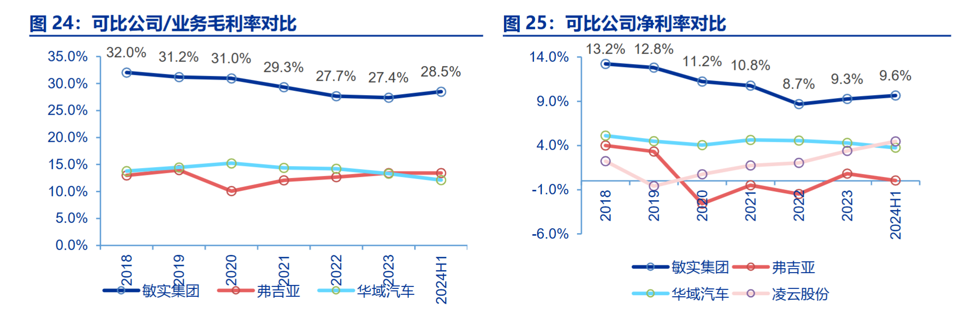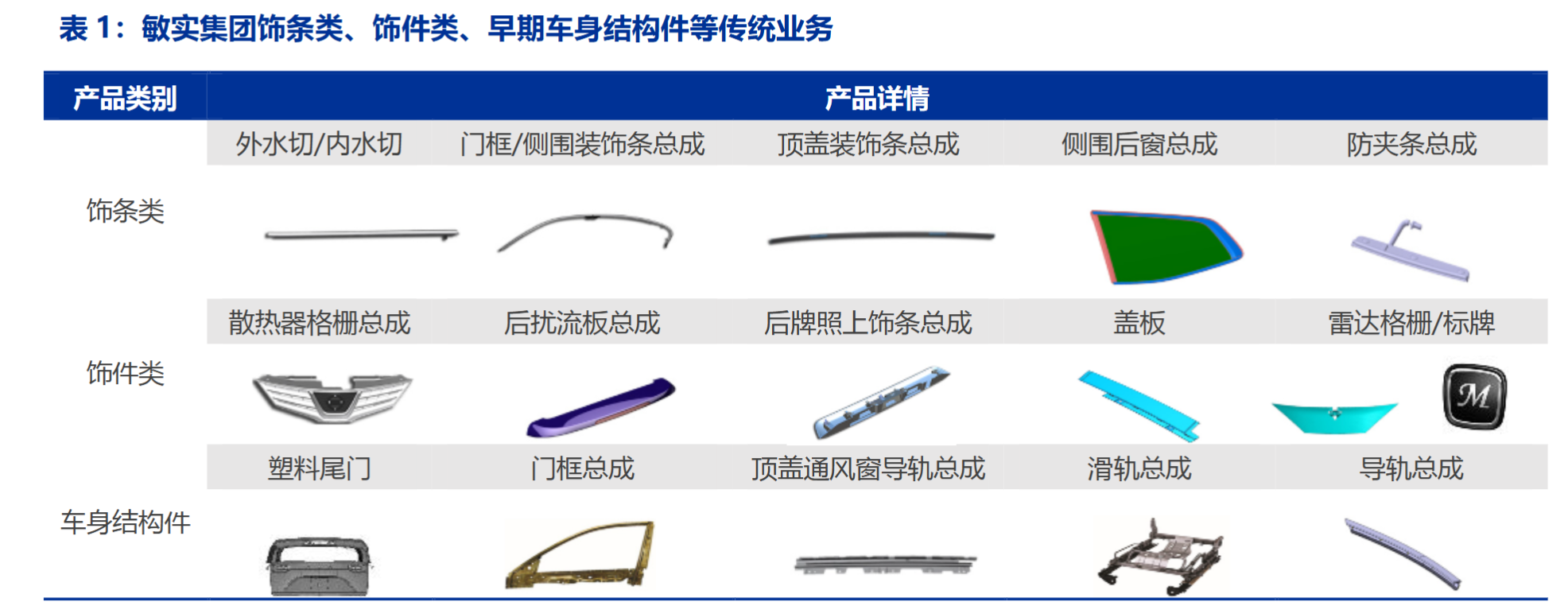 敏实集团,港交所上市公司。总部在中国宁波。相比公司主要聚焦在塑料内饰件,敏实集团的业务更为多元。截止 23 年,敏实集团业务中,金属/塑胶件/铜铝锻件/其他产品/电池分别贡献营收 54.6/56.3/43.3/23.9/35.4 亿元,占 比26.6%/27.4%/21.1%/11.6%/17.2%。信邦控股2023年整体营收才31亿元,敏实集团就塑胶件业务已经达到56.3亿元。
