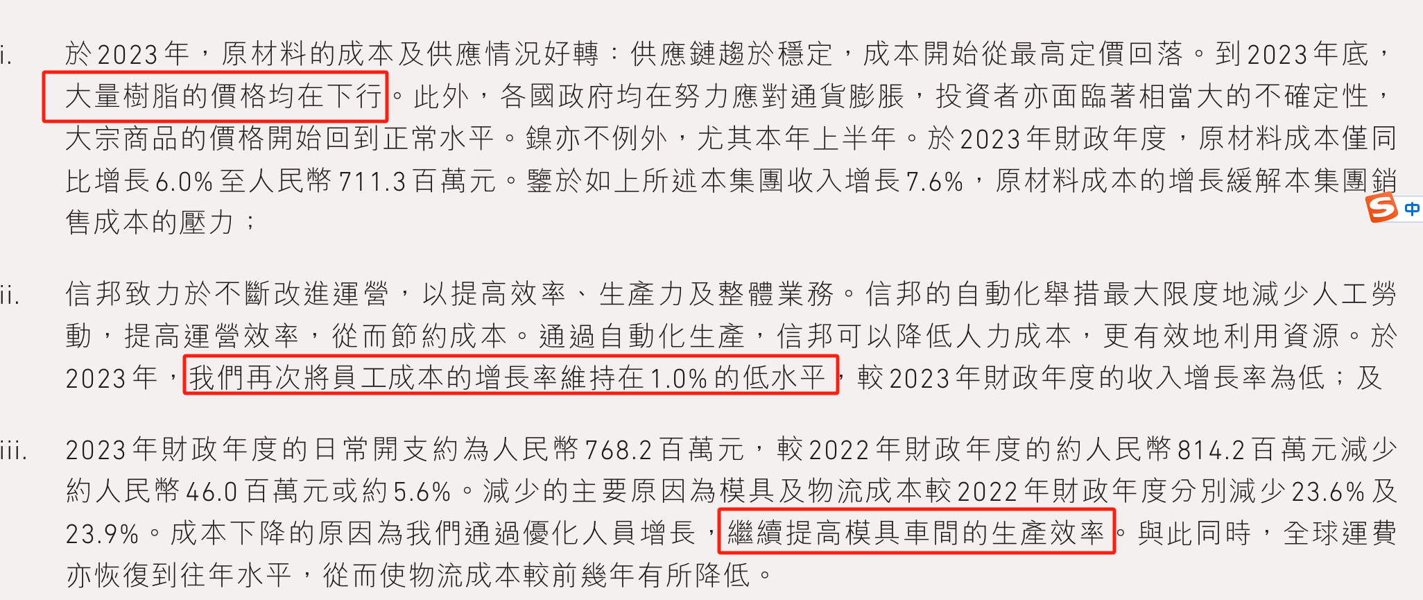 公司2023年销售毛利率35.5%,净利率19.5%,对于一家制造业,这个利润率水平非常高了,尤其还要面对下游tie1和汽车大厂这种议价能力很强的大客户。23年毛利增加的主要原因是原材料树脂的价格下降(石油价格下降)。另外,员工成本仅1%增长(后文可知,人均工资增长,但是人员数量下降)
