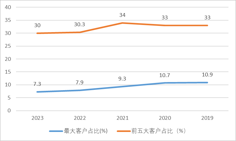 公司第一大客户占比从2019年的10.9%下降到2023年的7.3%。前五大客户占比从33%下降到30%。在总收入增加的情况下,客户集中度逐步降低,应该是客户整体的数量在逐步增加。