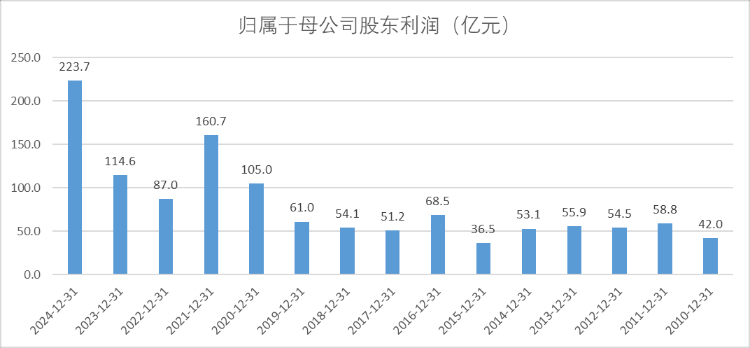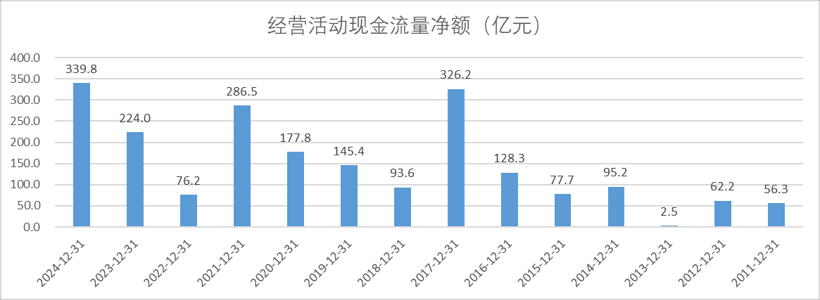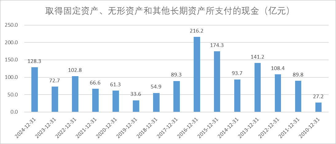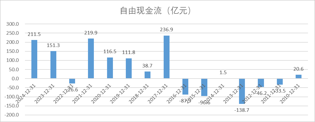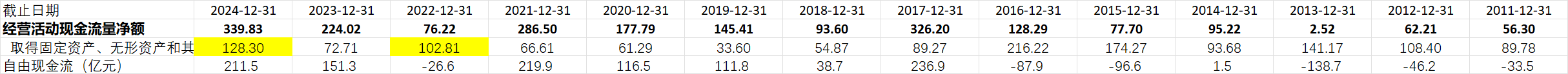 公司经营活动现金流净额24年达到了340亿元,创下历史新高。24年全年资本支出128亿元,对应24年自由现金流211亿元。