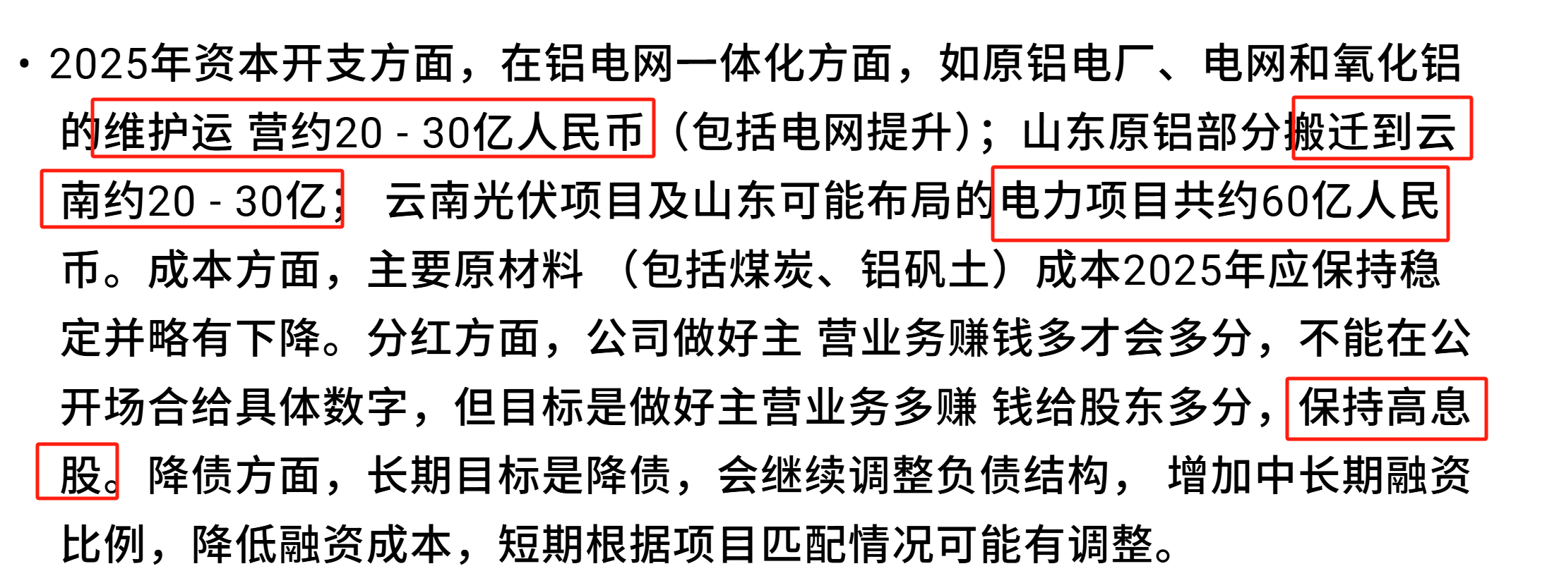 根据摩根大通的研报,公司25年的资本支出预计在130亿左右,与24年持平。根据这篇文章中记录的投资者问答情况,解释了公司25年资本支出主要的流向:20-30亿是维护性资本支出,20-30亿是山东搬迁云南的支出,60亿是新建电力项目的支出。