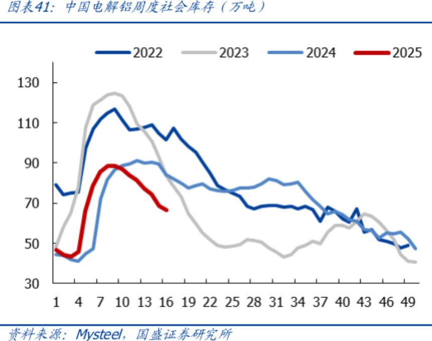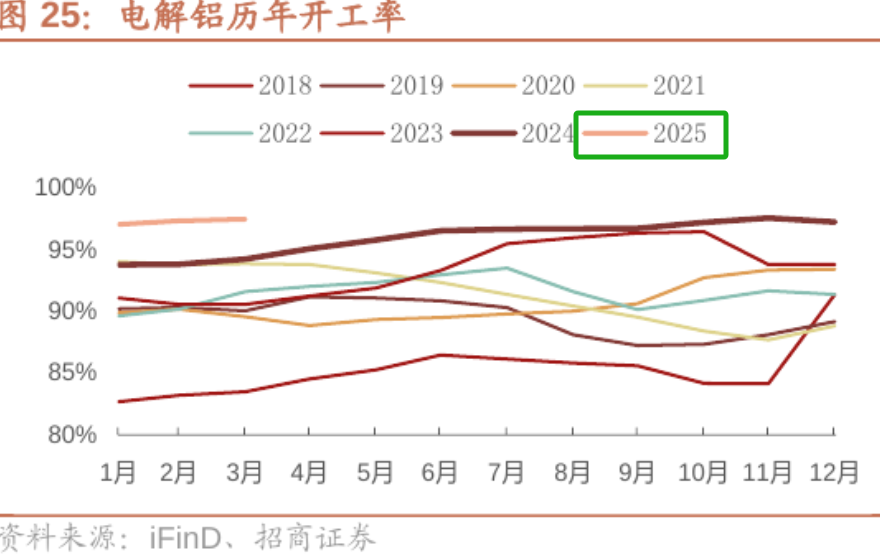 从下图也可以看出,25年电解铝行业的开工率已经达到了历史高位,也侧面印证了当前电解铝产能紧张。