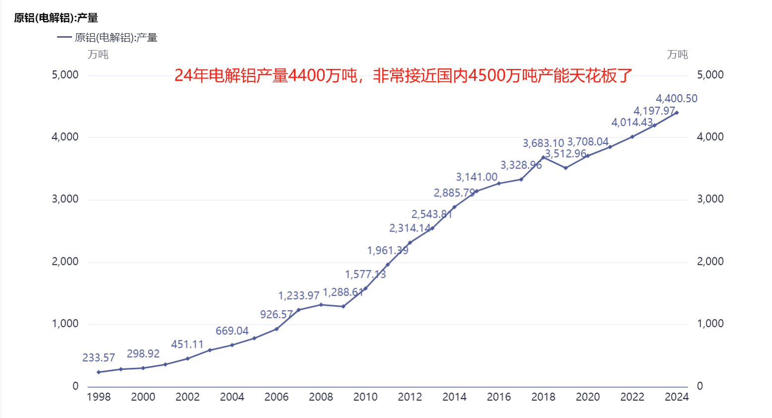 从下图电解铝的产量看,24年电解铝产量4400万吨,非常接近国内4500万吨产能天花板了。需求小幅的增长,但是供给却受到严格的限制,未来产品的价格大概率也是出于强势的状况。