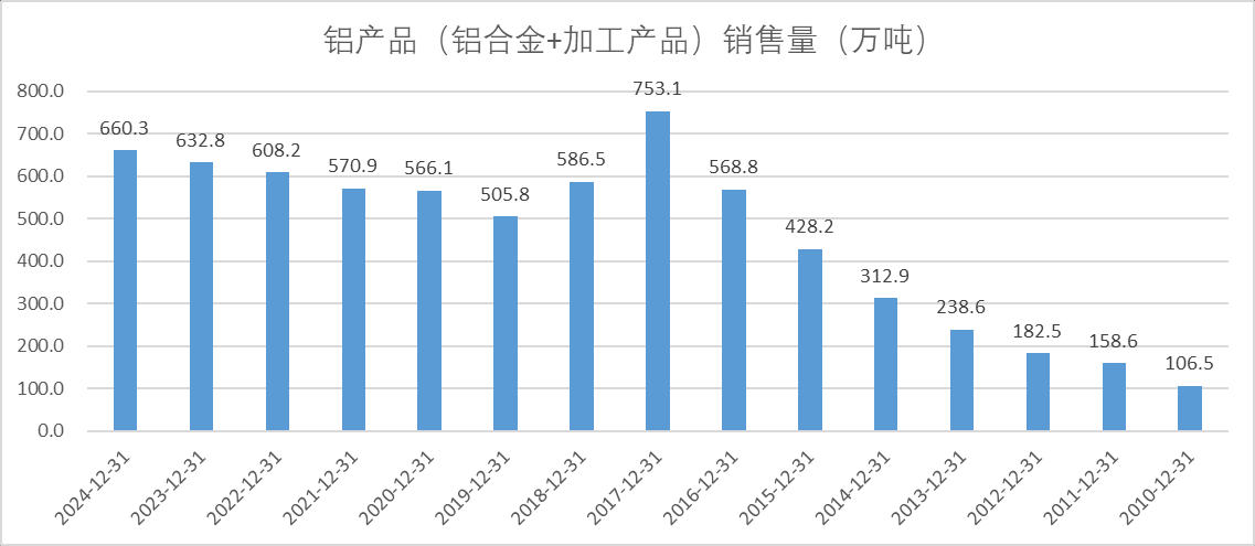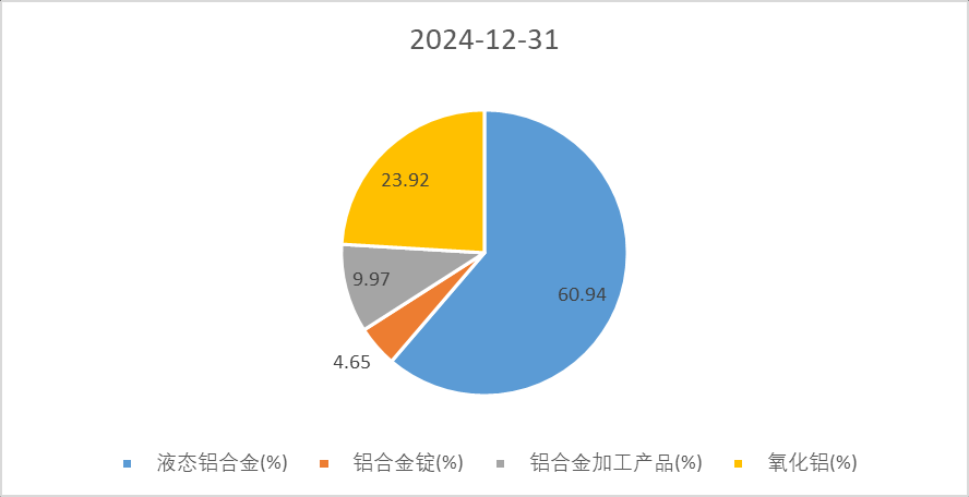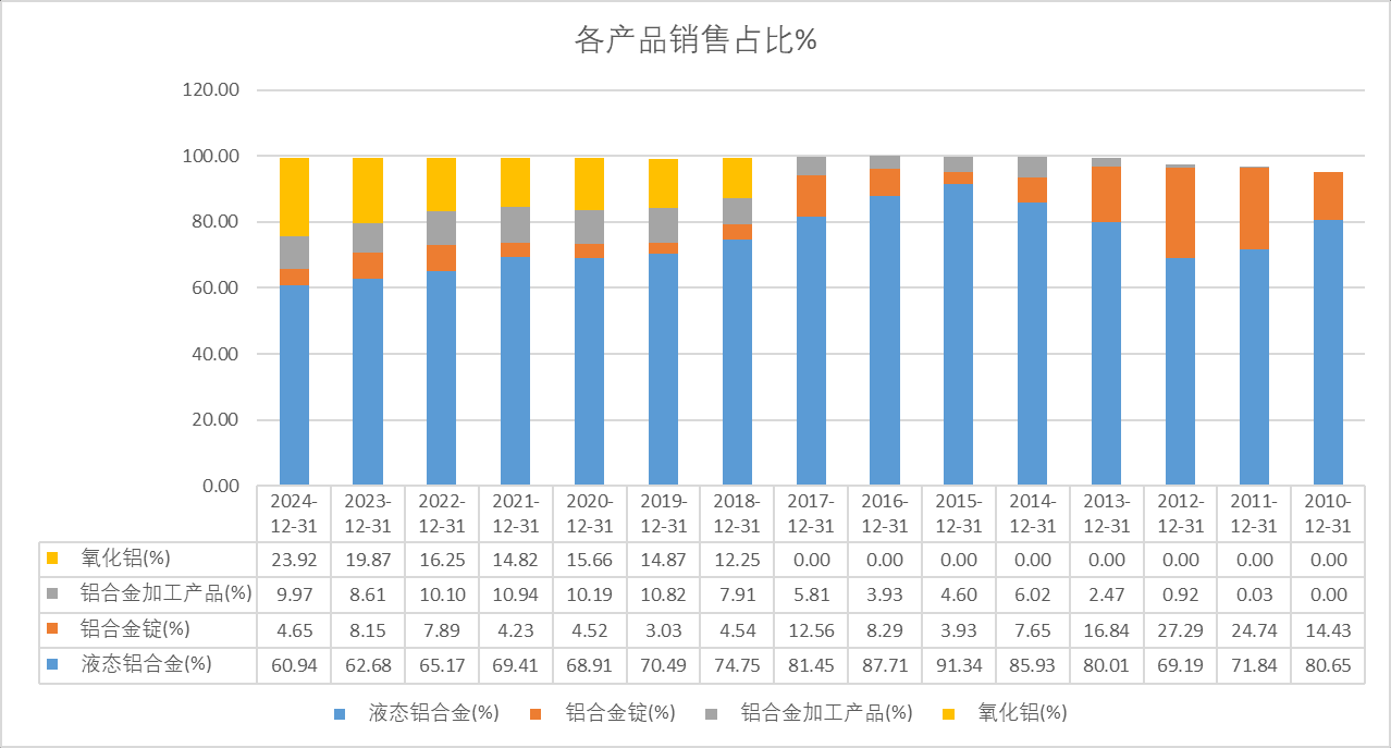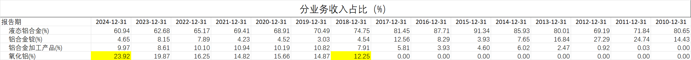 公司24年各项业务占比分别是液态铝合金(电解铝)占比60.9%,氧化铝23.9%,铝合金加工产品10%。