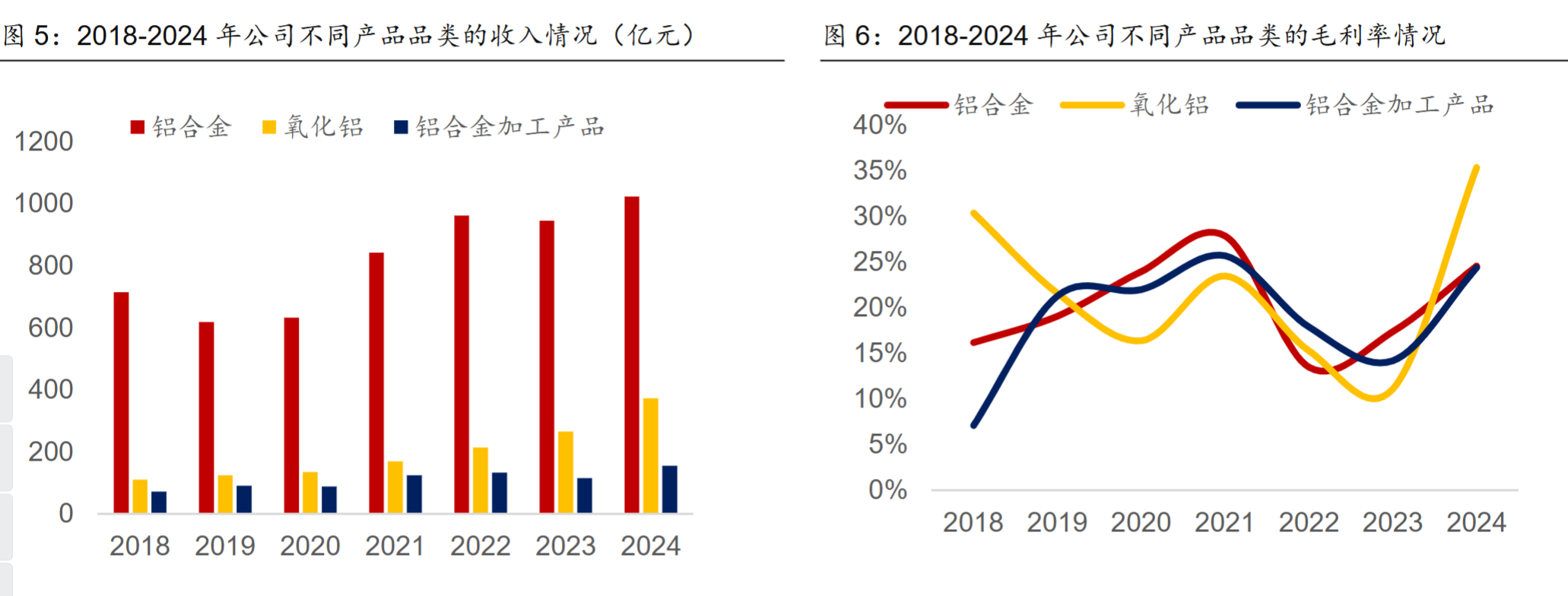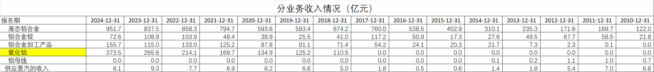 公司自2018年开始有氧化铝收入,收入持续增长,24年来自于氧化铝的收入达到了373亿元。总体来看,氧化铝业务是公司增速最快的业务,但是毛利率波动较大