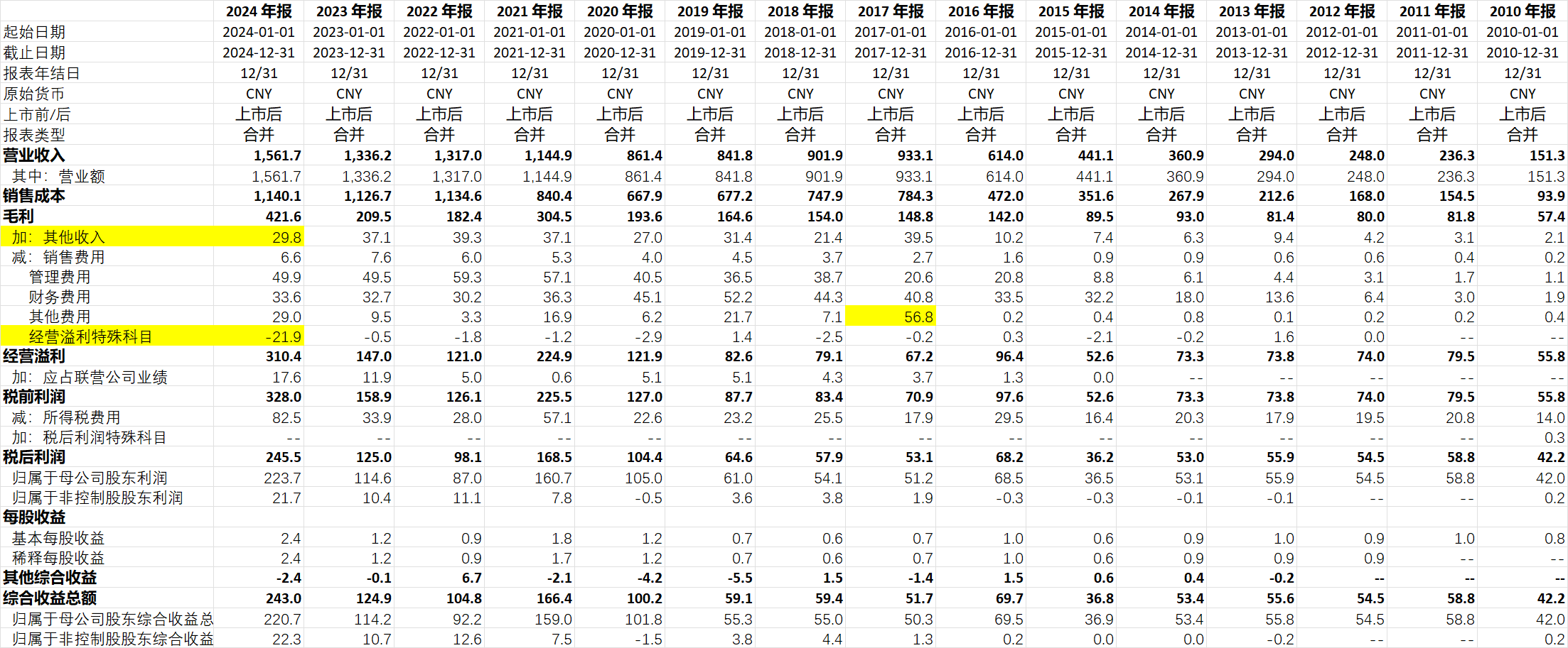铝合金加工产品收入也从2016年的24.1亿大幅增加到2024年的155.7亿。总体来看,铝合金加工产品业务无论是收入,还是毛利,占比均较低(收入占比 11%以内、毛利占比 14%以内)