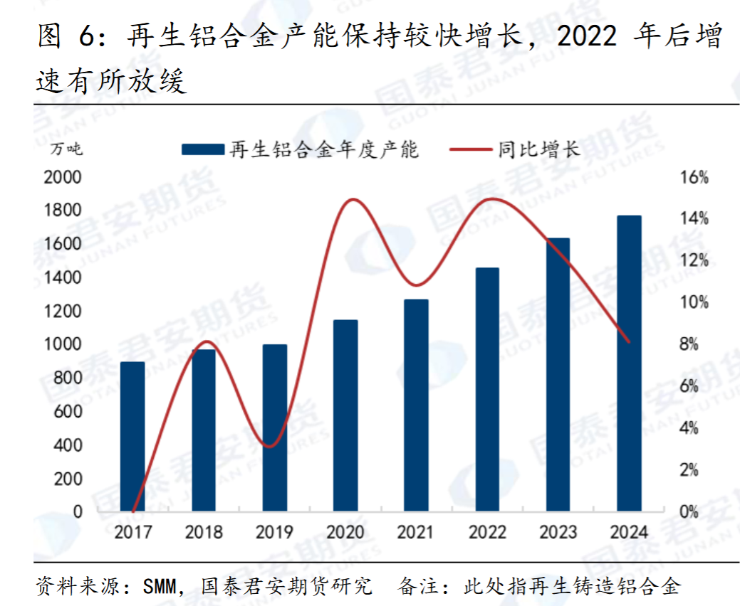 截至2024年底,中国再生铝总建成产能达1762万吨,2025年预计新增产能200万吨,总产能突破2150万吨,年复合增长率约13%。
