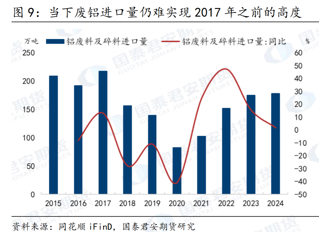 自 2017 年起,国内固体废物进口政策逐步收紧,废铝进口量逐年下降,加之 2020 年全球公共卫生事件爆发,废铝进口业务 遭到重创,2020 年全年废铝进口总量仅为 82 万吨,处于历史低位水平