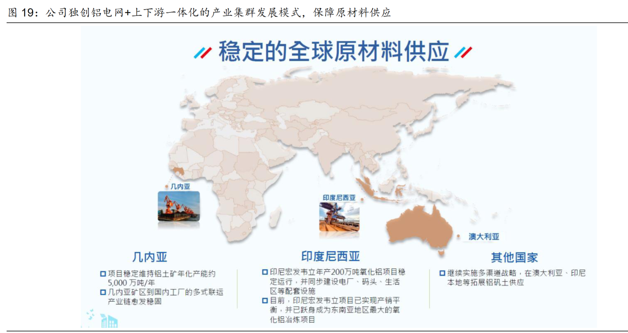 铝土矿:持续通过合资公司拓展几内亚铝土矿开发项目,确保集团拥有稳定的铝土矿原材料供应,并保障整体用料的价格稳定性及成本优势。 同时在印尼及澳大利亚拥有多样化铝土矿供应渠道。