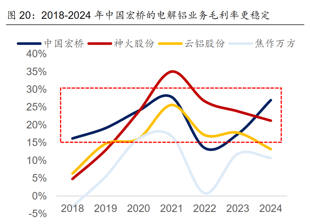 上下游一体化使得公司在保障原材料供应的同时,盈利能力稳定,同行业公司神火股份、云铝股份、焦作万方作为对比(均是从事电解铝生产及加工的行业头部公司),可以发现, 1、毛利率:2018-2024 年,中国宏桥的毛利率水平处于13.5%-27.9%的区间之内,神火股份为 4.8%-35.1%之间、云铝股份为 6.4%-25.7%之间、焦作万方为-3.0%-16.9%之间,中国宏桥的毛利率稳定性显著高于同行业可比公司。