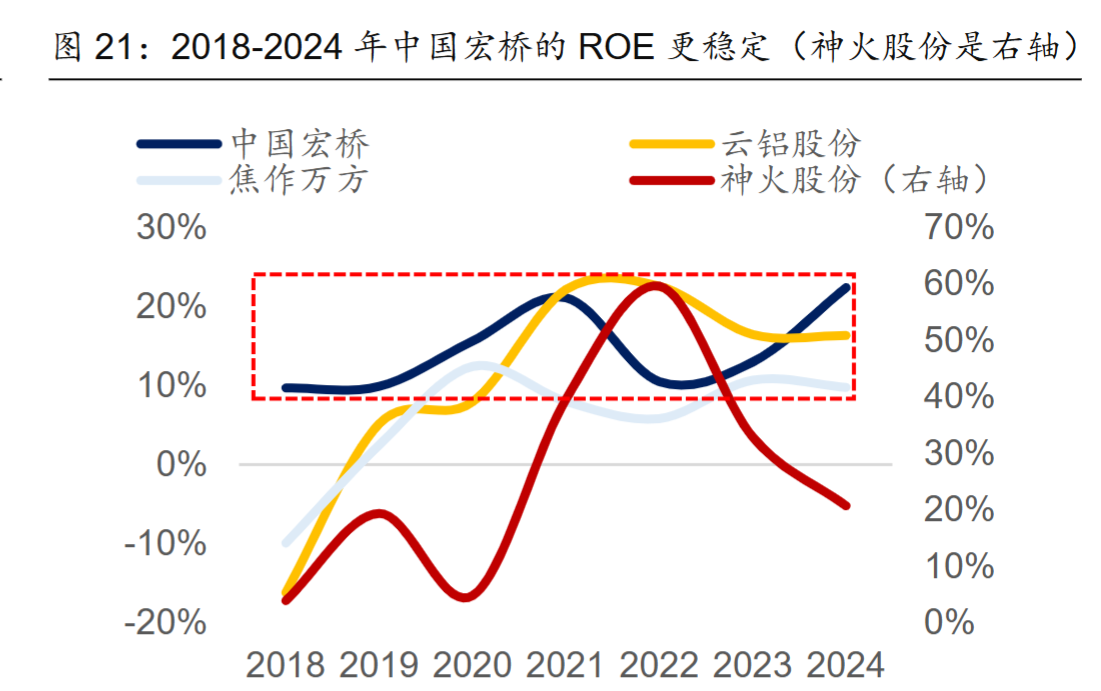 2、ROE:2018-2024 年,中国宏桥的 ROE(平均)水平处于 9.7%-22.4%的区间之内,神火股份为 4.0%-59.6%之间、云铝股份为-16.2%-22.5%之间、焦作万方为-9.9%-12.4%之间,中国宏桥的 ROE 稳定性显著高于同行业可比公司