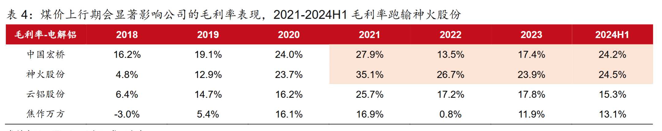 中国宏桥2010-2012年间的毛利率达到30%+,主要因为公司通过自建电厂(如山东基地)实现电力自给,2010-2012年自发电成本仅0.157元/千瓦时,显著低于国家电网电价(约0.45元/千瓦时)。由于电力成本占电解铝总成本的40%,这一优势直接降低吨铝成本约1500元,成为高毛利率的核心来源。但是由于同行业的竞争对手后续纷纷开始布局电厂,公司的这一竞争优势逐步变小,毛利开始下滑。