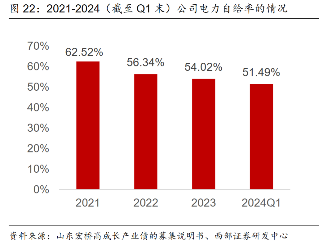 电力:公司的电力系统可持续稳定的供应生产,相对于全部网上购电模式,自发电供应可有效平抑外购电成本。云南生产基地依靠当地水电供应,有利于进一步降低用电成本。自产电力 供应:截至 2024 年 3 月底,公司装机容量为 992 万千瓦,电力自给率为 51.49%;2021-2023 年,公司电力自给率分别为 62.52%、56.34%、54.02%;公司自产电力的主要原材料为煤炭