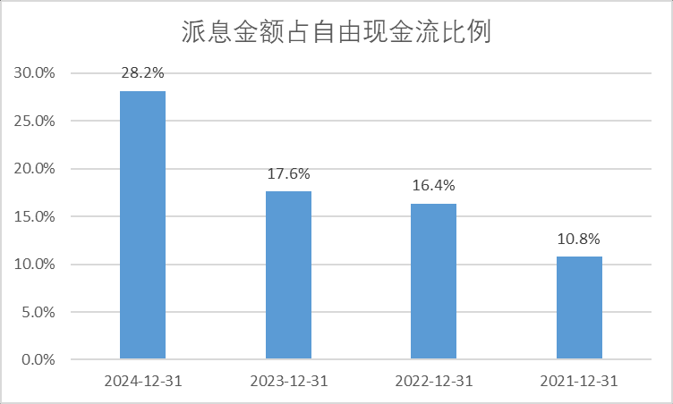 如果看公司派息金额占自由现金流的比例,自21年以来逐步提高,24年达到28.2%。这个绝对值其实并不高。因为没有派息的自由现金流拿去还掉了负债。23,24年分别还掉了59.2亿,77.2亿有息负债。相信随着未来公司负债进一步降低后,派息金额占自由现金流的比例会进一步提高。