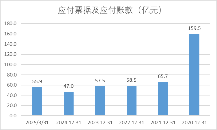 应付票据及应付账款55.9亿元:自20年以来,大幅减少了103.6亿元。