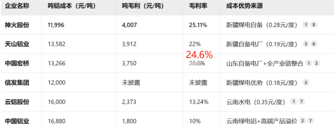 下图是deepseek整理的数据,供大家参考(神火股份,天山铝业,云铝股份,中国铝业的数据我去年报验证过,没有问题。中国宏桥deepseek统计的23.6%有问题,年报披露的是24.6%)。注意:下面毛利率数据采用的是公司24年电解铝业务的毛利率,不是公司整体的毛利率。