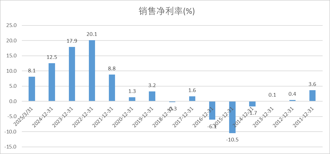 同样,公司的净利润在21,22年大幅上涨,主要因为电解铝和煤炭价格大幅上涨。22年以来下滑,主要煤炭价格的下跌。此外,24年,以及25年一季度利润下跌,除了煤炭价格下跌,还因为氧化铝原材料的价格大幅上涨。(公司参股广西龙州新翔生态铝业(持股比例 36%)具备氧化铝产能 100 万 吨/年。参考吨电解铝消耗 1.93 吨氧化铝以及 24 年约 160 万吨电解铝产量核 算,公司氧化铝自给率约 11.7%,这个氧化铝的自给率不足以消化氧化铝大幅上涨带来的成本上涨)。