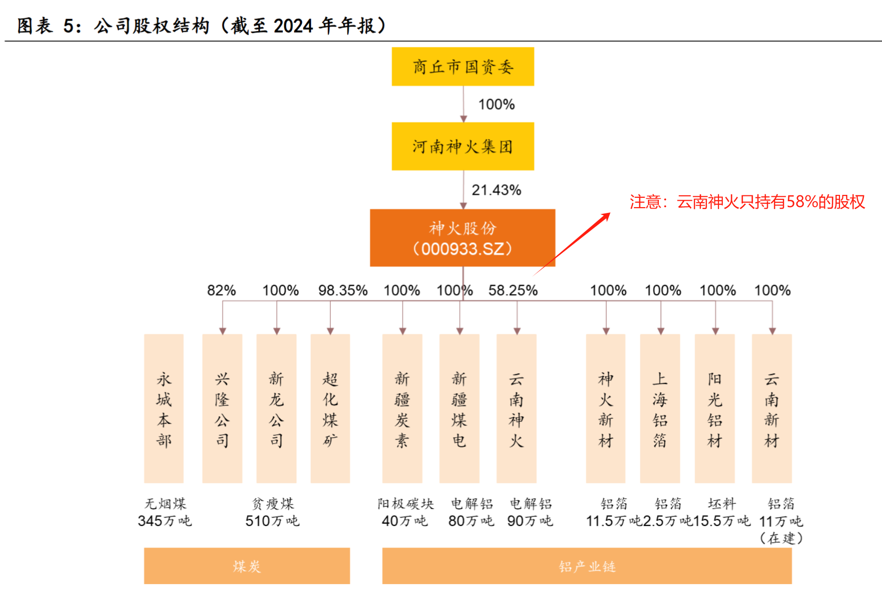 公司主营业务为铝产品、煤炭的生产、加工和销售及发供电。公司2006 年通过收购沁澳铝业进入 铝行业,2010 年、2018 年分别在新疆、云南地区布局电解铝业务。公司股权及产能如下图: