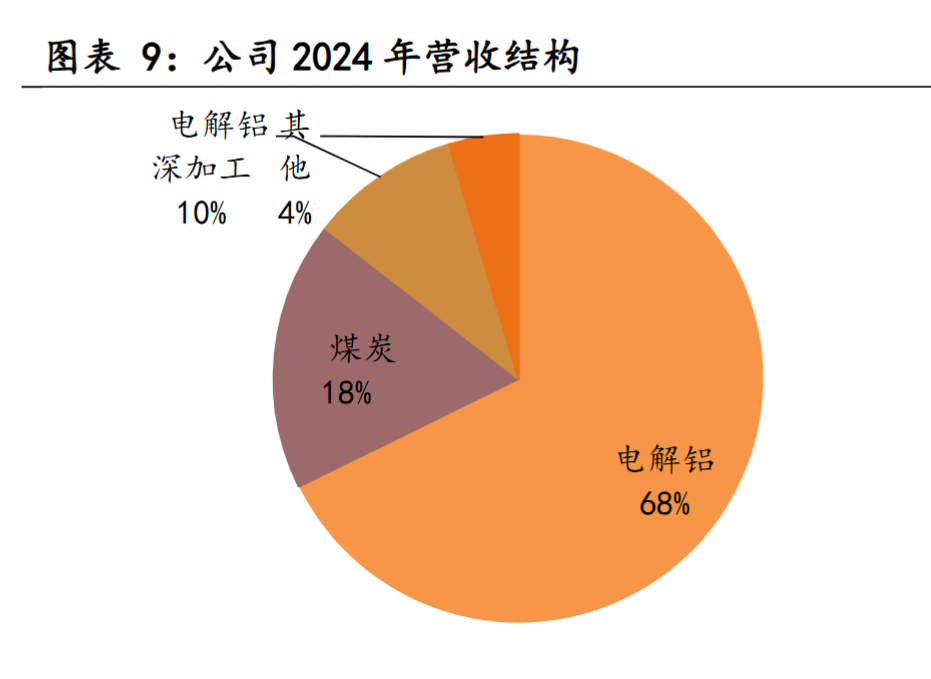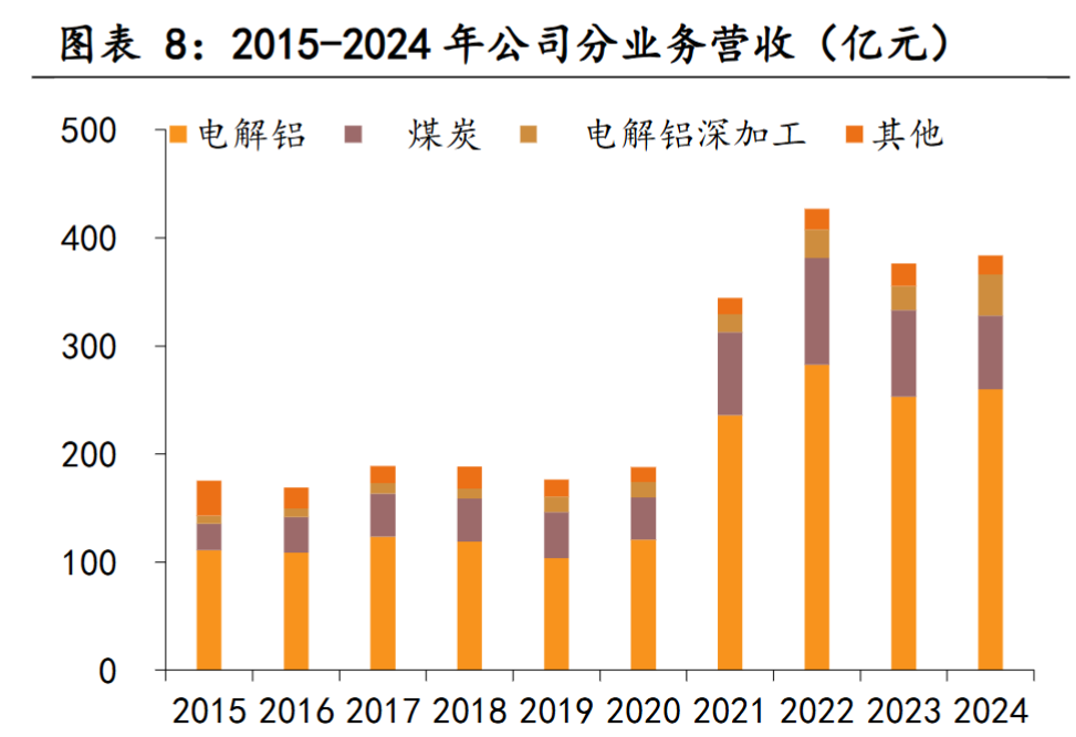 分业务营收来看,电解铝为公司第一大营收来源,2020-2024 年营收占比在 64%-68%,2024 年公司电解铝/煤炭/电解铝深加工/其他业务营收分别 259.9/68.3/37.9/17.6 亿元,同比+2.8%/-14.7%/+69.4%/-15.6%,占总营收比 重为 67.7%/17.8%/9.9%/4.6%