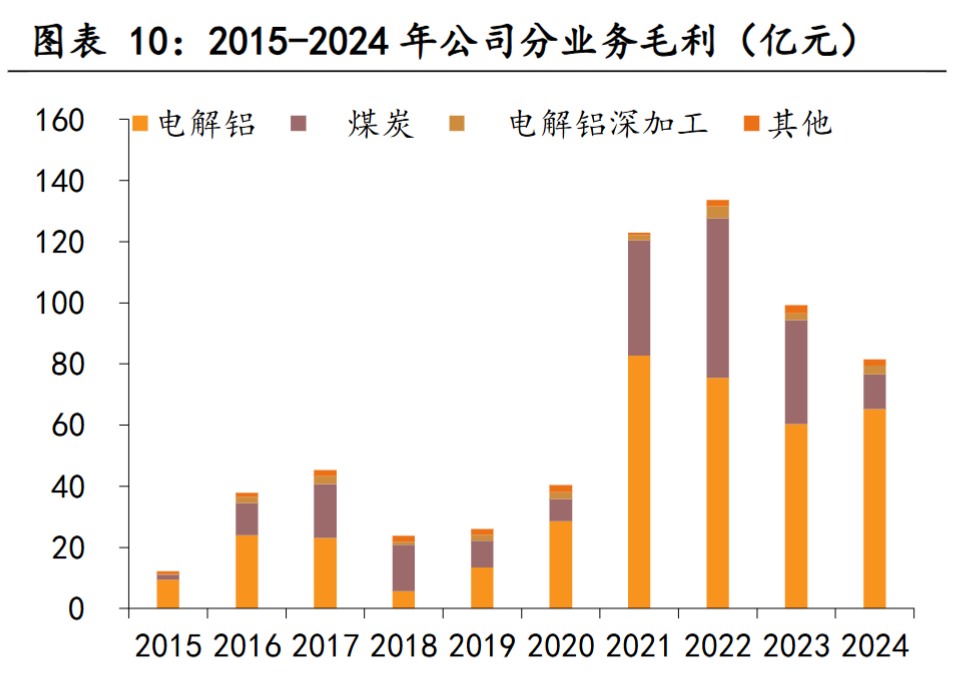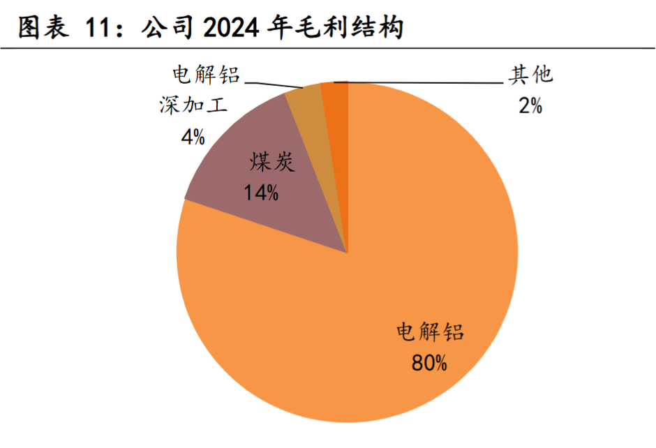 分产品毛利来看,煤铝业务贡献公司主要盈利,2020-2024 年毛利占比合计基本在 90%左右,2024 年公司电解铝/煤炭/电解铝深加工/其他业务毛利分 别 65.3/11.4/2.8/2.0 亿元,同比+8.1%/-66.5%/+31.4%/-24.9%,占总毛利比 重为 80.1%/14.0%/3.5%/2.4%,2024 年煤炭业务受到安监影响产量下滑、成本提升致盈利贡献显著下滑