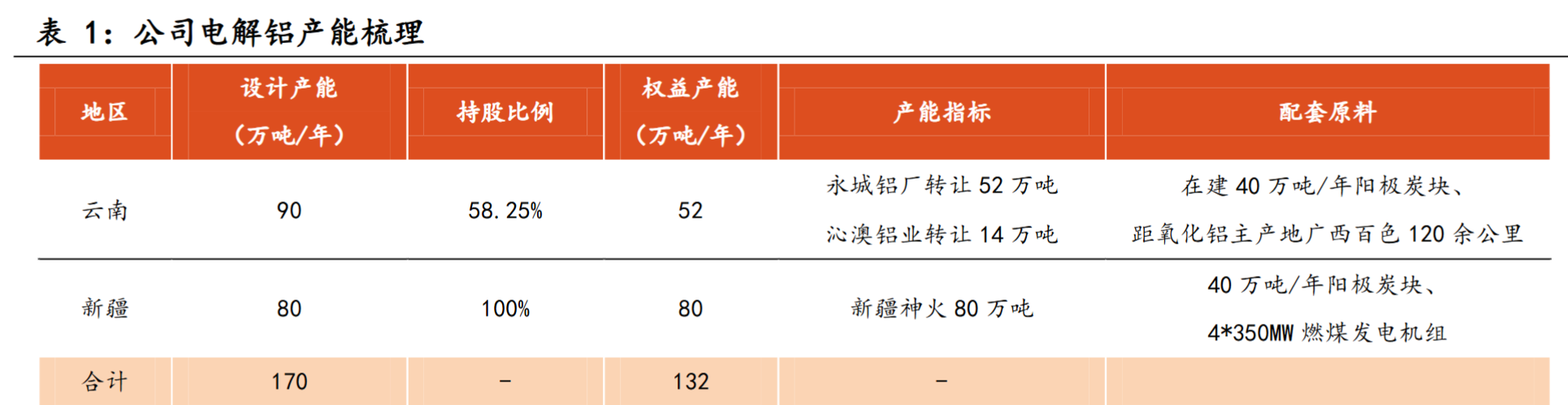 1)电解铝业务:截至 2024 年末有电解铝产能 170 万吨/年(新疆 80 万吨/年+云南 90 万吨/年,云南项目只持有58%的股权),此外新疆有 40 万吨/年阳极和 4*350MW 燃煤机组、云南有在产 40 万 吨/年阳极。