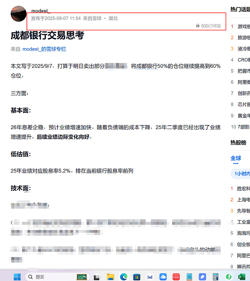 这两年我养成了费曼学习法,尽可能把自己的逻辑写出来,有时候是写在雪球,有的时候是写在自己的有道云笔记。我9.7号写的加仓成都银行交易思考发在雪球上,因为文章关于基本面的分析一笔带过,主要内容都是关于技术面分析的(后面还有很多内容没截图),准备发的时候,猜到我的大部分粉丝可能会排斥这个内容,于是改成了仅仅对我自己可见了。