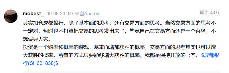 我知道关注我的很多朋友是因为我写公司的基本面分析,9.6号我说加仓成都银行还有交易层面的思考,结果那天掉了几十个粉丝。可能很多做价值投资的本能就对交易排斥吧。