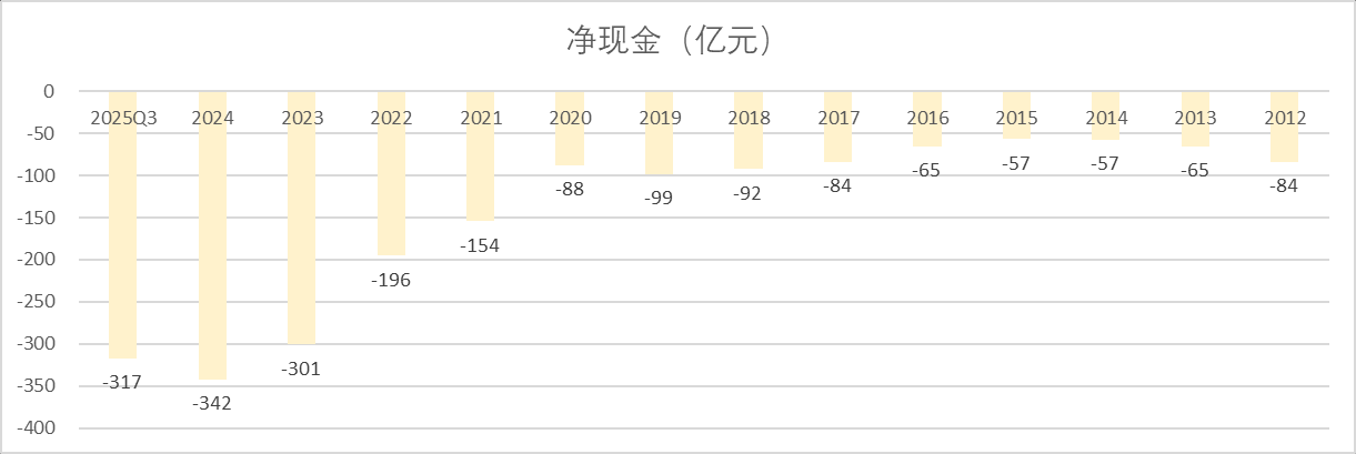 用净现金=货币资金 - 短期借款 - 长期借款 - 应付债券 - 一年内到期的非流动负债。伴随公司最近几年的资本支出,公司24年的净现金达到了-342亿。25年由于盈利情况较好,公司净现金稍微好转。