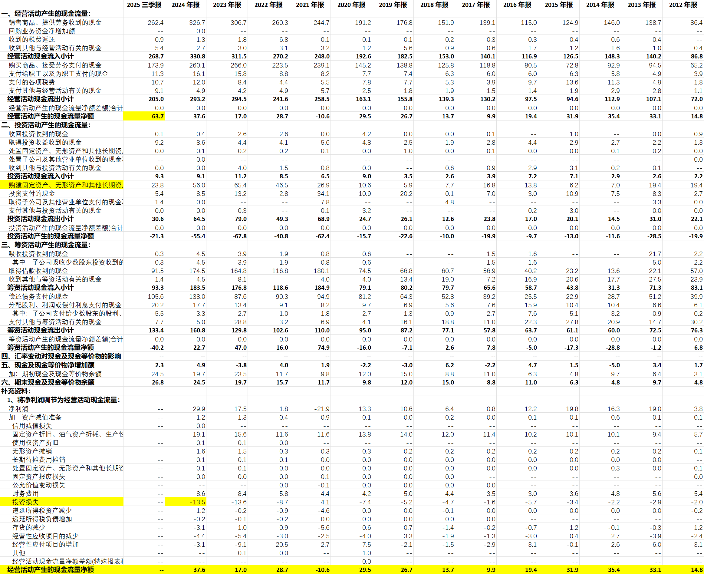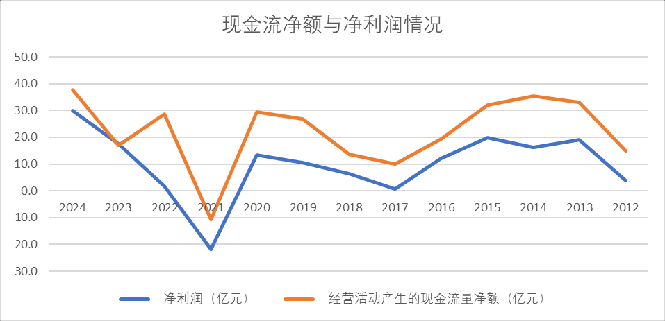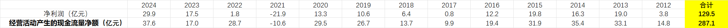 由于公司账面具有较大的固定资产,固定资产的折旧使得公司的经营活动现金流远大于净利润。自2012-2024年间,公司共产生利润129.5亿元,而经营活动现金流却达到了287亿元,经营现金流净额/净利润=221.6%。