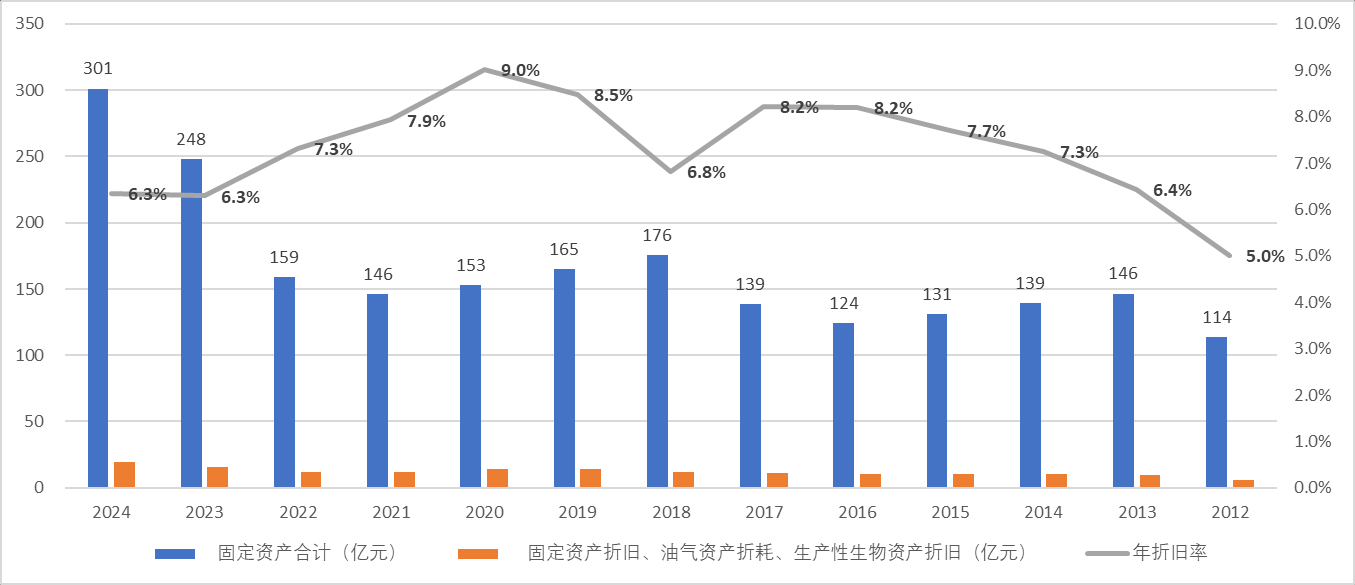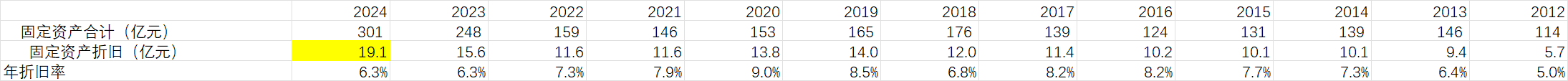用固定资产年折旧金额/固定资产来计算固定资产的折旧率,可以看到随着公司固定资产22年后逐步增加,公司的固定资产折旧率在下降,也就意味着公司新投产的固定资产折旧年限越来越长了。24年的折旧期大概是15.8年。