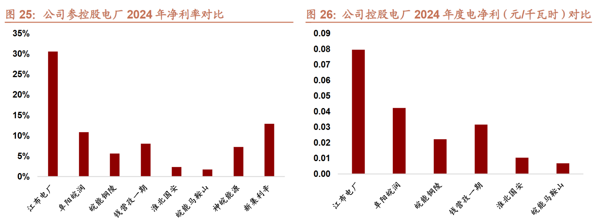 投资收益:2023及2024年,公司分别投资收益13.6亿元、13.5亿元,稳定的投资收益为公司业绩长期稳健增长提供保障。2025H1,公司实现对联营合营企业的投资收益4.15亿元,同比下滑28.6%,主要系神皖能源和新集利辛净利润分别同比下滑34.4%和28.1%(这两家是煤电一体化的公司,业绩受煤价波动相对较小,业绩下跌大概率是因为上网电价和火电利用小时数的原因)