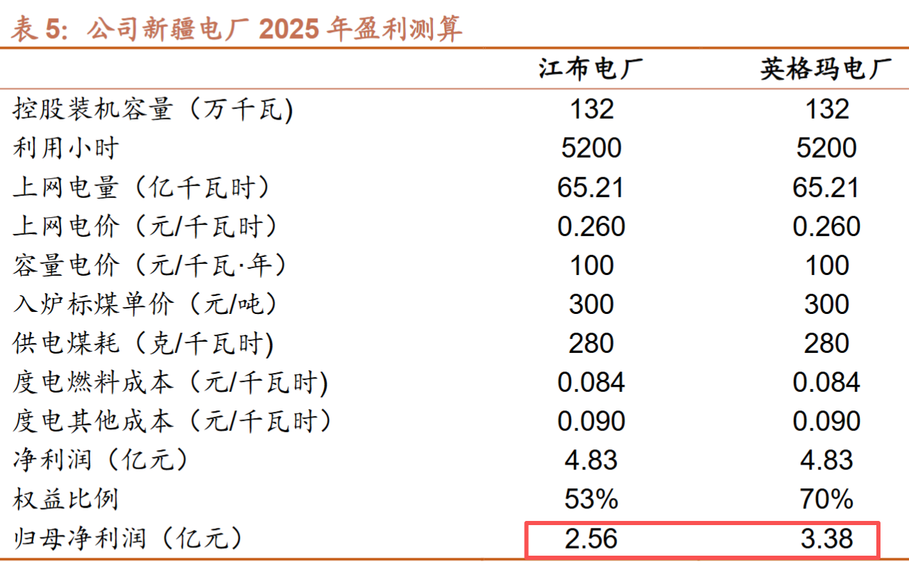 两座新疆电厂是新疆运输电力至华东区域的特高压吉泉线的配套电源。根据招商证券测算,按照上网电价0.26元/千瓦时、入炉标煤单价300元/吨测算,公司新疆两座电厂2025年将贡献归母净利润5.94亿元,占公司2024年整体业绩的28.8%。