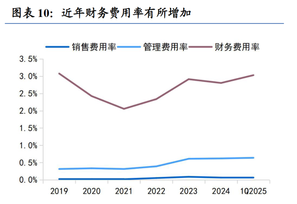 虽然近些年的利率下降,但是因为公司负债规模增加,公司财务费用率保持上行,目前大概在3%左右的水平。(逆向来看,随着公司资本支出降低,负债偿还,财务费用都是未来潜在的净利润增加部分)