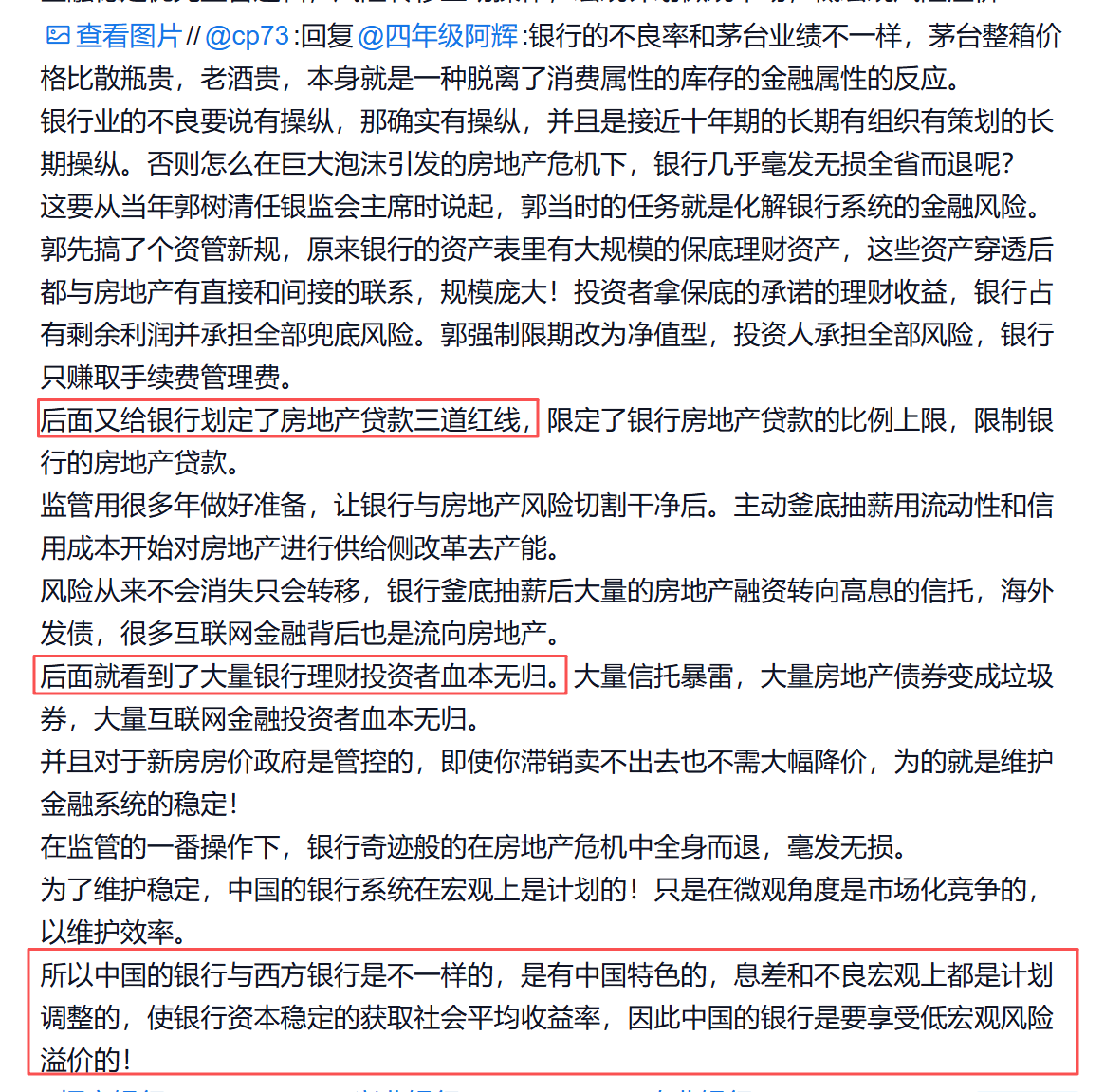 关于中国监管机构对银行业的呵护历史,大家可以参考@cp73 前辈的一段论述,我这里截图放在下面。