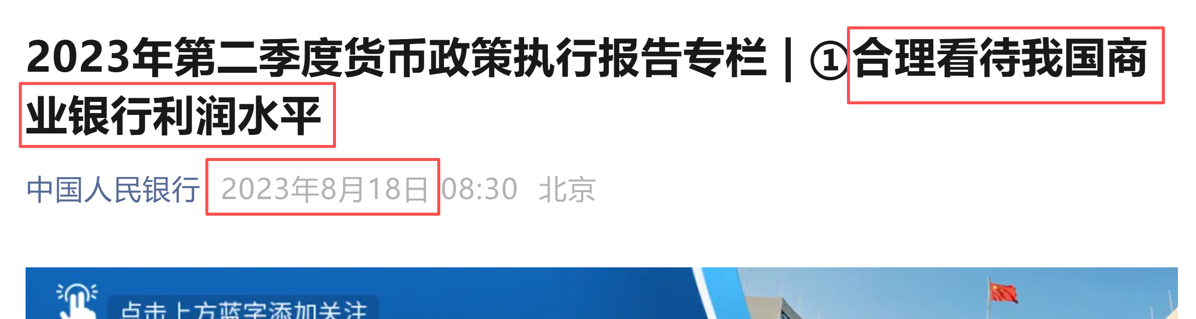 央行23年8月份的时候就发表了一篇文章《合理看待我过商业银行的利润水平》文章通过对比我国和美国银行业的息差,提出来银行通过合理方式维持自身稳健经营,可以提升其持续支持实体经济发展能力。这篇文章可以看出央行呵护我过银行业息差的意图,因为只有银行维持住合理的利润,才能维持一定的货币增速,只有一定的货币增速,才能支撑实体经济的发展。