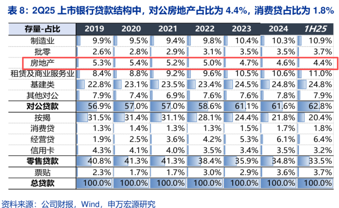 不仅房地产的不良贷款率在下降,房地产在银行贷款的占比也再不断下降,这也符合房地产下行后,银行收缩房地产贷款的趋势,截止25H1房地产贷款占银行贷款比例仅4.4%。