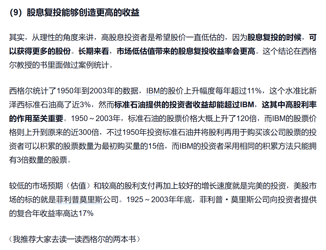 今天的中国银行业已经陷入了一种“有罪推定”,一上来就先主观认为中国银行业有问题,不仅是“有罪推定”,即便中国银行业拿出了房地产贷款占比下降,房地产不良率下降的数据,也会被怀疑有其他隐藏的风险,甚至会对银行披露的数据产生怀疑。 当然其实我认为这对于投资银行业是好事情,因为有无数双眼睛盯着你,一但出现些许问题,就会很快被监管机构重视。而且其实对于长期基本面不下滑的企业,股价越低,最终的长期收益反而更高。我曾经写过一篇帖子(网页链接{高股息思维为什么重要 })中就提到了西格尔教授的研究案例: