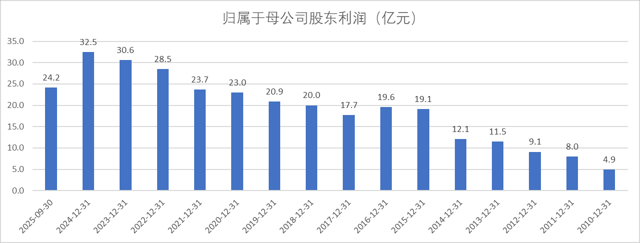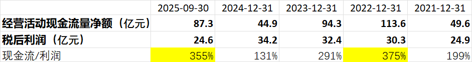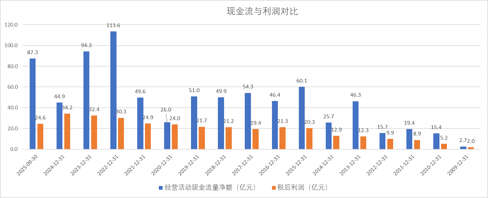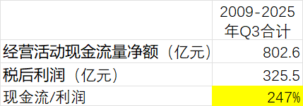 公司的经营活动现金流远高于税后利润(因为经营现金流是合并报表口径,所以这里没有选择归母净利润,而是包含少数股东的税收利润),2209年至2025年Q3,公司一共实现净利润325.5亿元,实现经营现金流净额802.6亿元,现金流净额是税后利润的2.47倍。