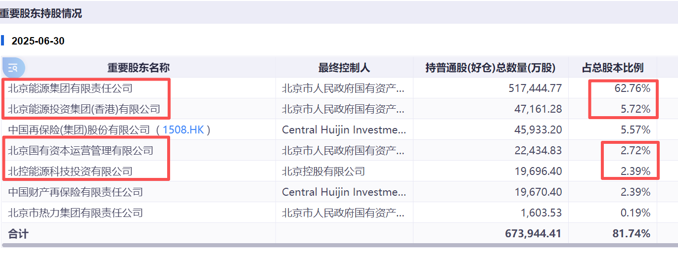 公司控股股东为京能集团,京能集团为北京市政府出资设立的国有独资公司,控股京能清洁能源(0579.HK)、京能电力(600578.SH)、昊华能源(601101.SH)、京能置业(600791.SH)、北京能源国际(0686.HK)、京能热力(002893.SZ)六家上市公司