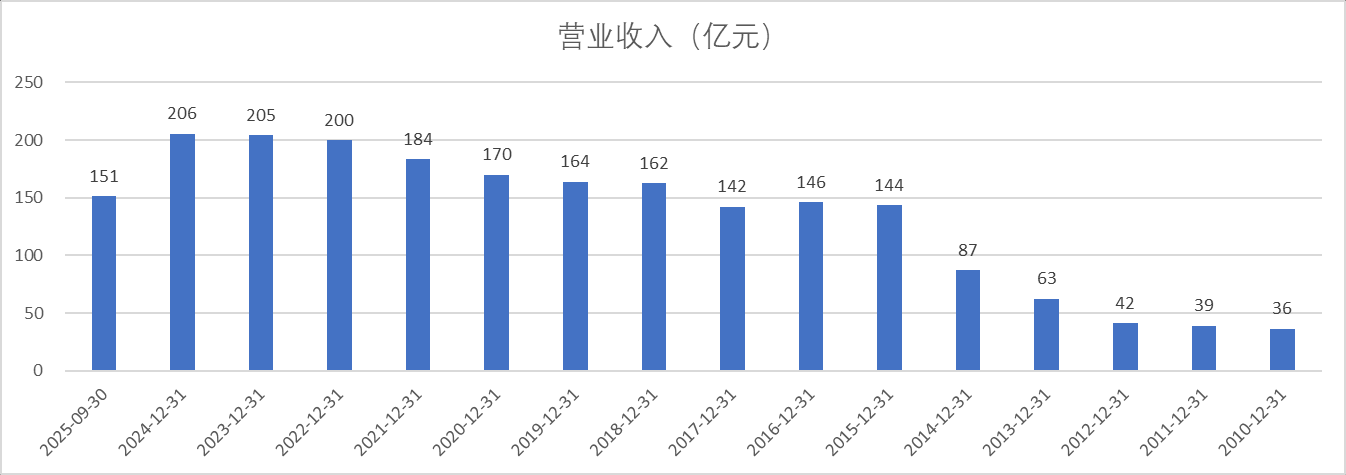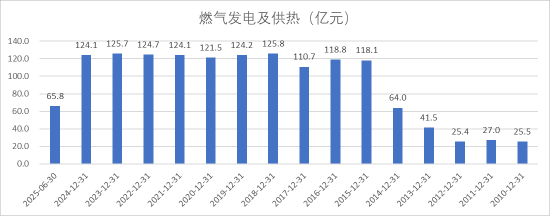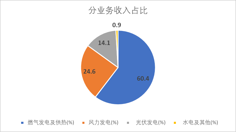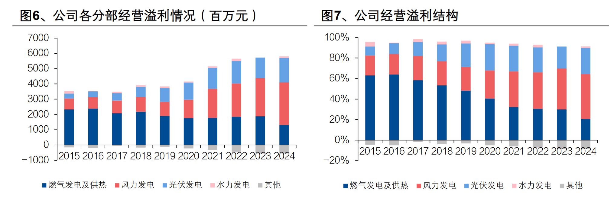 2015-2024 年间,公司营业收入由 143 亿增长至 206亿,年均复合增速 4.1%,其中燃气发电及供热/风力发电/光伏发电收入由 118/15.7/5.3 亿 元 增 长 至 124/47.1/30.9 亿 元 , 年 均 复 合 增 速 分 别 为 0.6%/13%/22%,占公司营业收入比重由 82%/11%/4%变动至 60%/23%/15%。