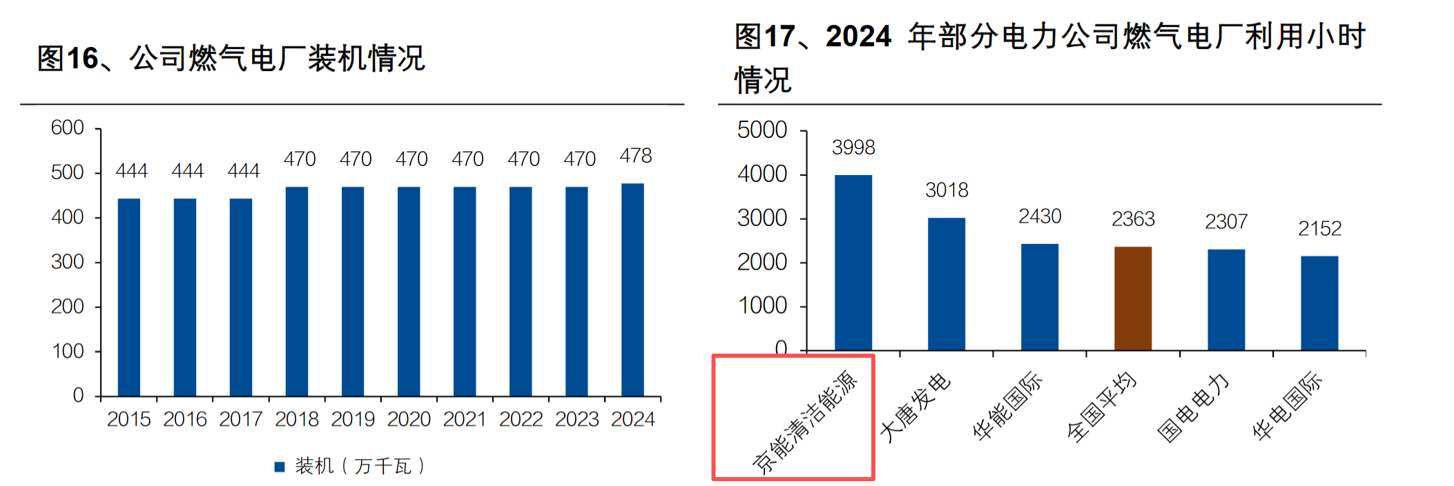 作为北京本地基荷电源,公司气电利用小时数位居行业前列且保持相对平稳。公司北京燃气机组均为热电联产机组,同时承担首都供电与供热职能,2024 年公司燃气电厂利用小时数达到 3998 小时,高于全国平均水平 1635 小时;(从下面的图也可以看到大唐发电的燃气电厂利用小时数业高于全国水平较多,主要原因是大唐发电也有较多电厂在华北地区。)