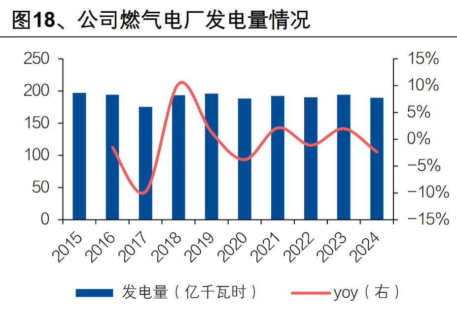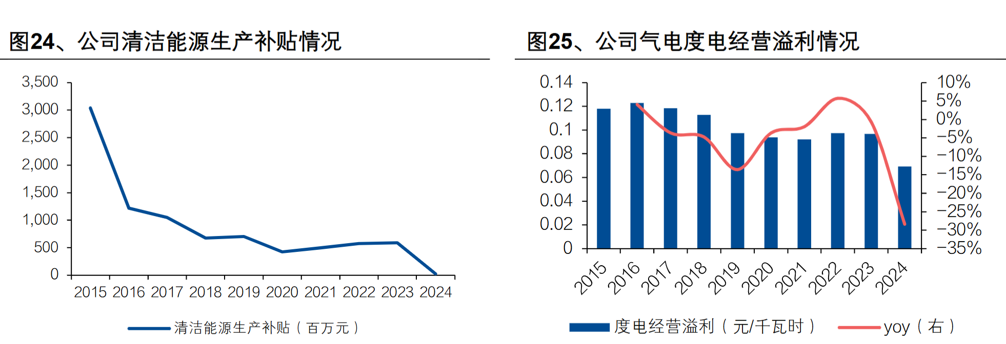 2015-2024 年间,公司气电业务营业收入由 118 亿元增长至 124 亿元,年均复合增速 0.8%,主要是由于公司气电发电量与电价基本保持稳定;经营溢利由 23.3 亿元下降至 13.1 亿元,降幅 10.1 亿元/44%,其中两次主要的利润下降发生在 2019 与 2024 年,2019 年主要是由于增值税率降低导致的电价下调使得经营溢利同比下降 2.7 亿元,但实际税后电价基本不变,2024年主要是由于一次性的政府补贴取消使得经营溢利同比下降 5.7 亿元。