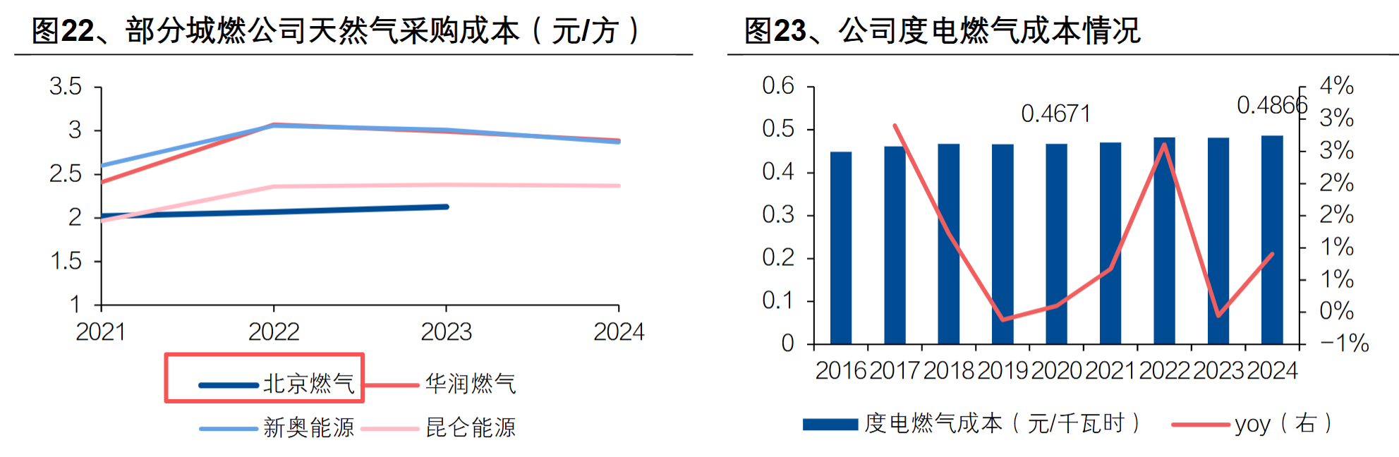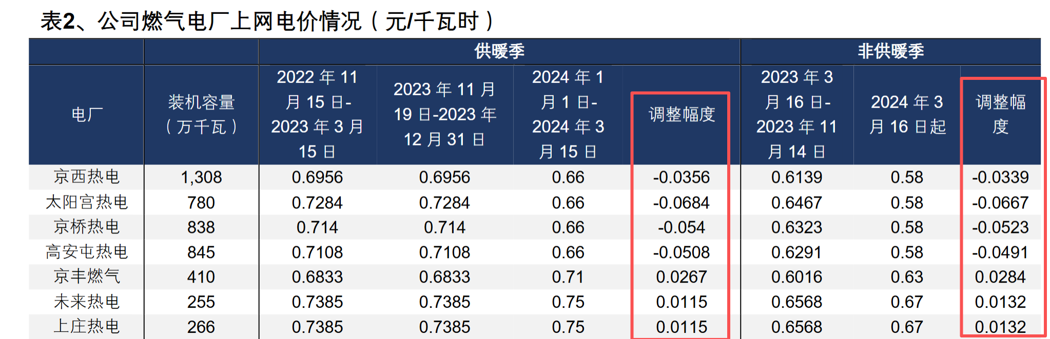 过往公司上网电价由临时结算电价+补贴形成,2024 年取消补贴后改为电网全额结算。从过往的电价结算机制来看,北京市燃气电厂在投产前申请核定电价,由市发改委牵头委托中介机构进行电价测算,市财政局将该价格与临时结算价格的 差额与发电量的乘积列入市财政预算,燃气电厂每年按照发电量计划申请当年补贴。2024 年 1 月,公司收到北京市发展与改革委关于调整上网电价的通知,将上网电价改为国网全额结算,不再收取财政补贴,公司北京燃气电厂 2024 年 3 月 16 日起加权平均电价下降约 0.035 元/千瓦时。