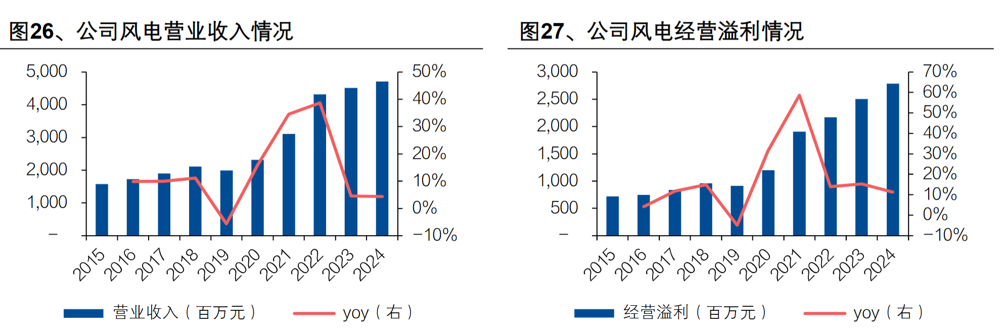 装机量增长驱动风光利润提升,2024 年占公司经营溢利比重已达 84%。2015-2024 年间公司风电/光伏营 业收入由 15.7/5.3 亿元增长至 47.1/30.9 亿元,年均复合增速分别为13%/22%, 经营溢利由 7.2/3.2 亿元增长至 27.9/16.1 亿元,年均复合增速分别为 16%/20%, 占公司经营溢利的比重由 21%/10%提升至 53%/31%。