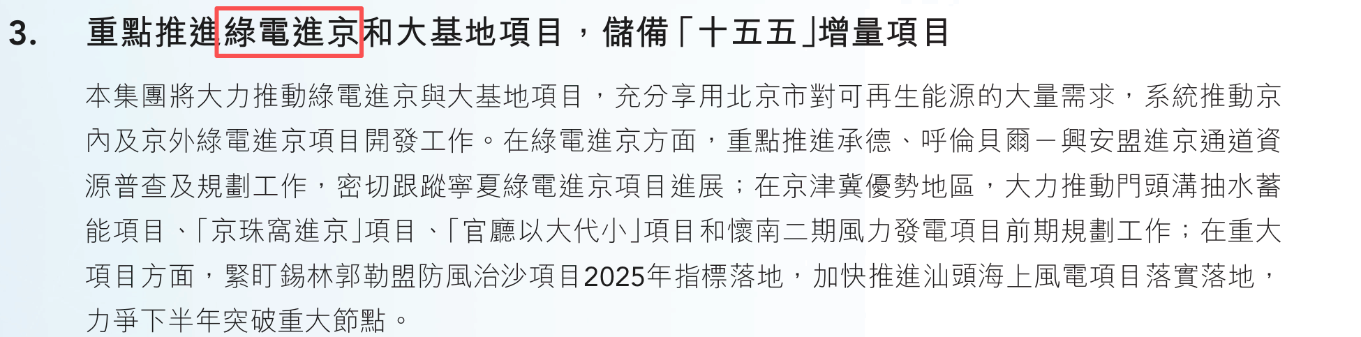 公司后续项目主要重点是推荐“绿电进京”。根据北京市政府21年发布的《北京市可再生能源电力消纳保障工作方案(试行)》。绿电在输送和调度上享有优先权,因此,公司后续项目的利用小时数大概率能得到保障。