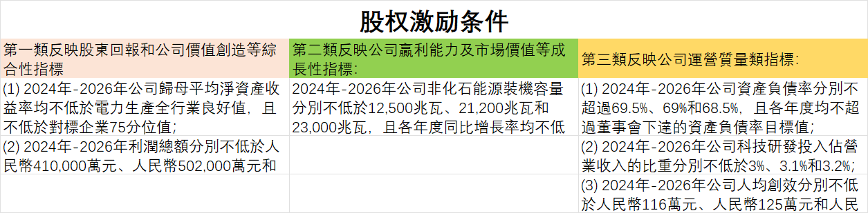 2023 年 12 月公司公告股权激励计划授予约 1.24 亿股 H 股股份,约占已发行股本的 1.5%,授 予对象包括公司董事会主席、总经理等人在内的 113 名高管及核心骨干。激励计 划要求 2024-2026 年公司税前利润不低于 41 亿元、50 亿元、52 亿元,累计非化 石装机容量不低于 1250、2120、2300 万千瓦,资产负债率不高于 69.5%、69%、 68.5%。