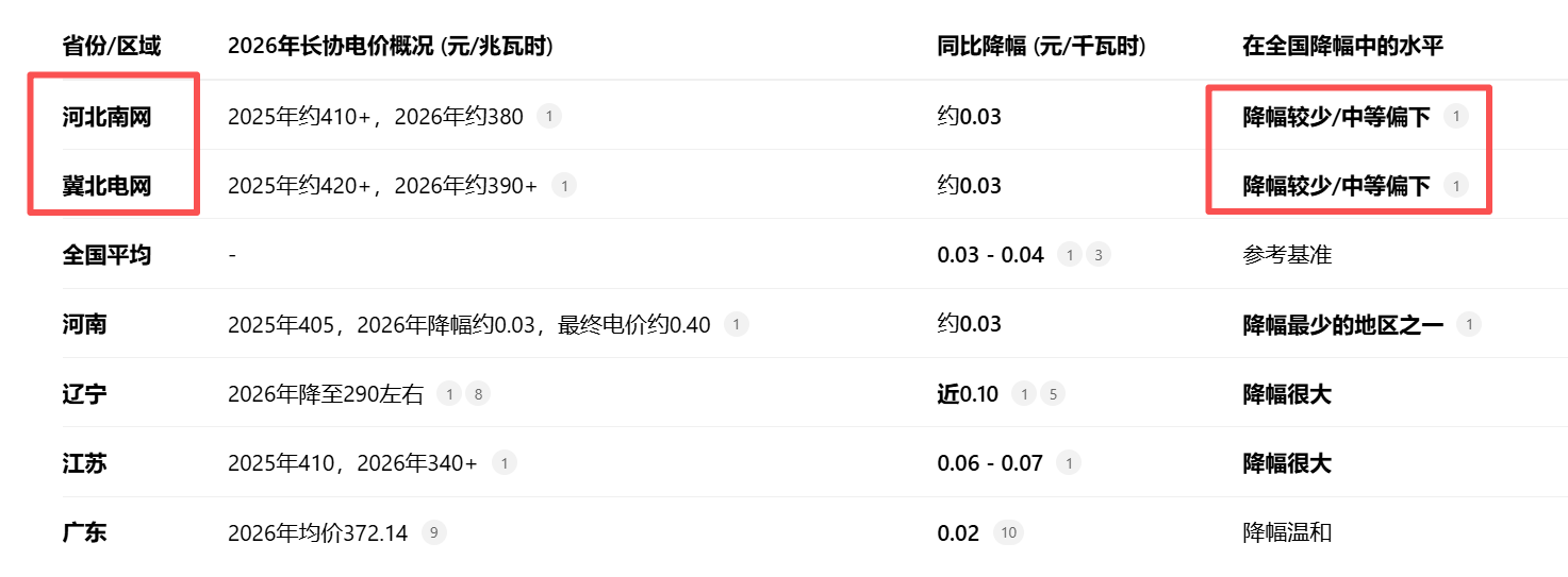 2026年的长协电价中,河北的电价下降幅度低于全国平均水平,并且河北的电价基数也较高,25年长协电价在420元/兆瓦时左右,这个价格也高于全国大多数水平。