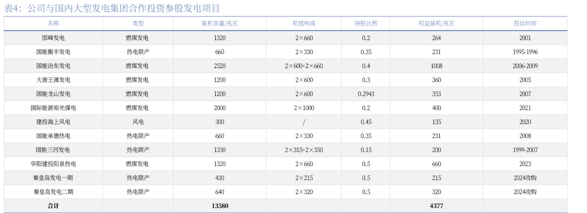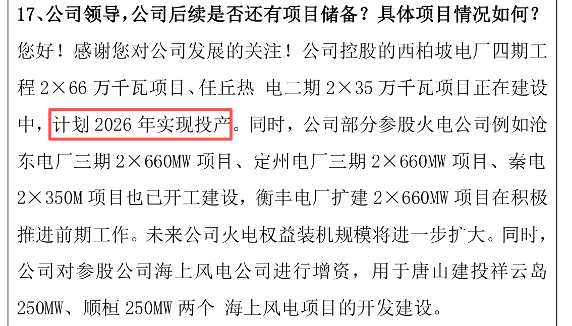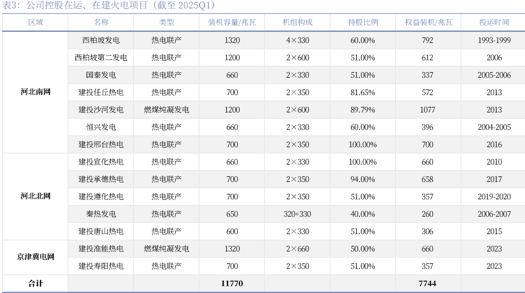公司在河北北部电网拥有建投宣化热电、建投承德热电、建投遵化热电、秦热发电和建投唐山热电5家发电公司,装机容量占河北北部电网统调煤电装机的24.94%。同时,公司在山西区域拥有建投寿阳热电,内蒙区域拥有建投准能发电。同时公司西柏坡电厂四期2X660兆瓦项目、任丘热电二期2X350兆瓦项目已开工建设,计划2026年实现投产运营。