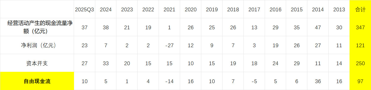 2013年以来公司累计实现经营现金流净额347亿元,净利润121亿元,资本开支250亿元,自由现金流仅仅97亿元。