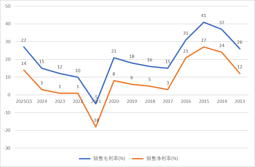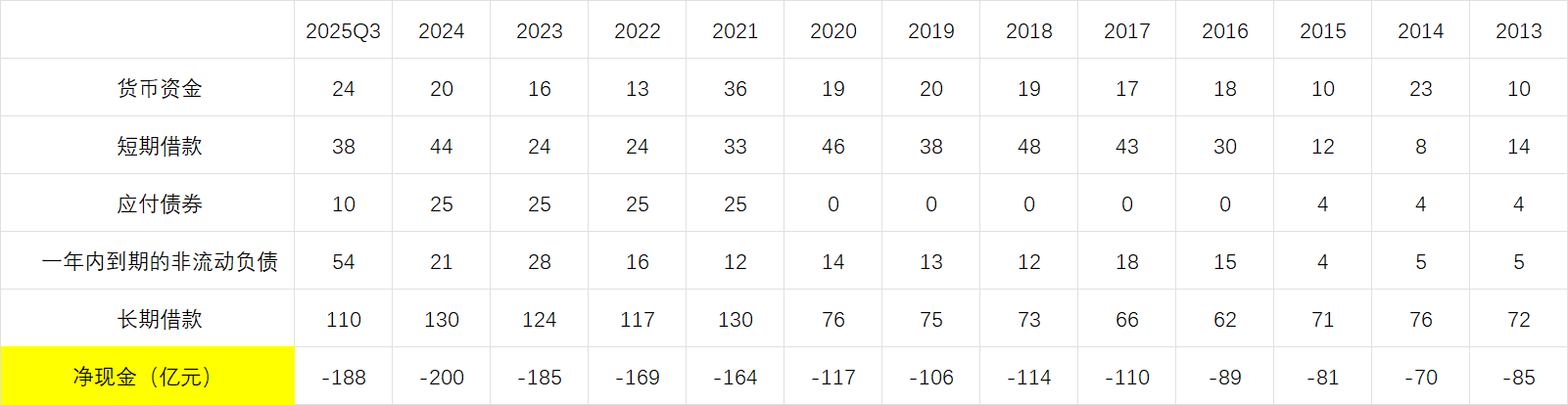 净现金情况:由于公司持续的资本开支,再加上公司前些年盈利情况一般,导致公司的负债逐步增多。截至25Q3,公司账面净现金-188亿元,得益于25年较好的盈利情况,公司25年净现金略有好转。